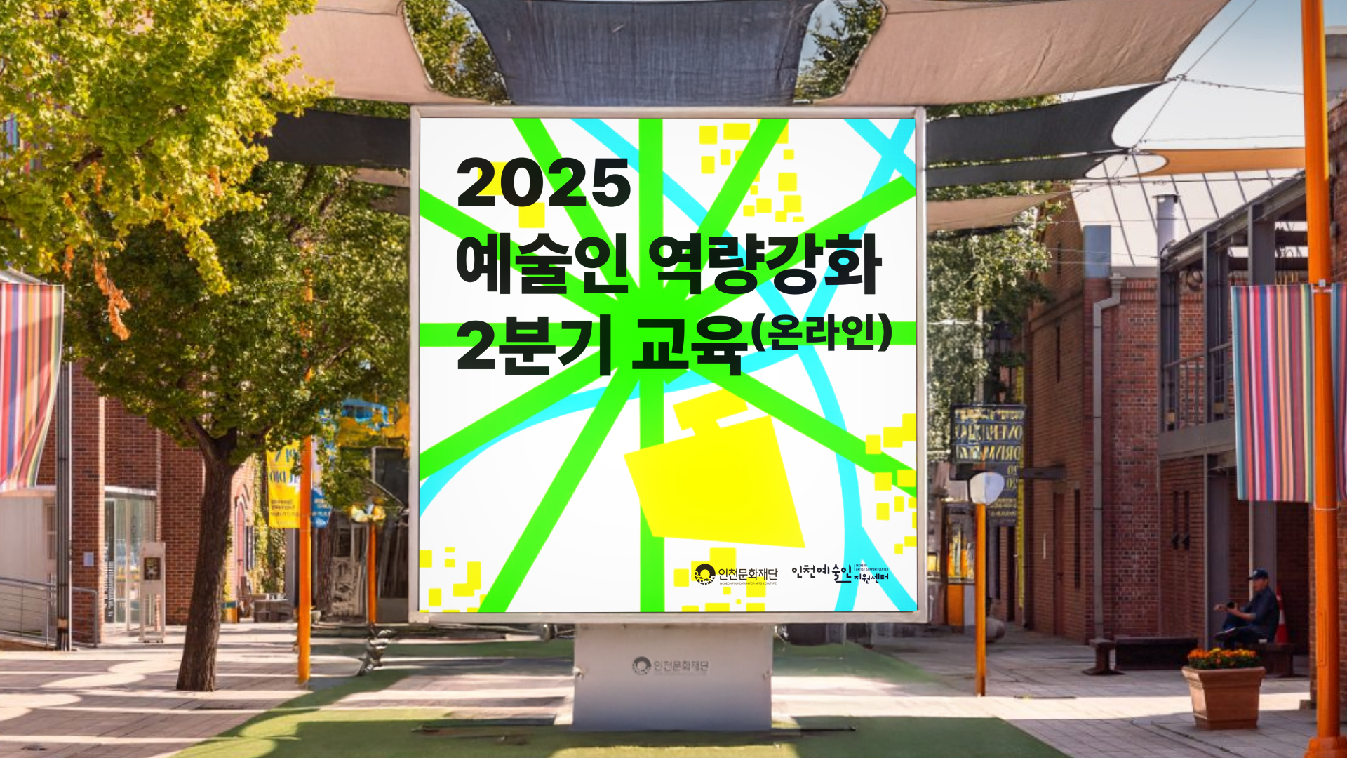 녹색 라인은 경로와 선택지를, 파란 곡선은 흐름과 지형을, 노란 블록은 성취의 지점을 상징해 교육 과정을 하나의 플레이 필드처럼 표현했습니다. 강렬한 색 대비와 굵은 서체는 주목성을 높이고, 동시에 “성장의 단계”라는 메시지를 직관적으로 담아냈습니다.
